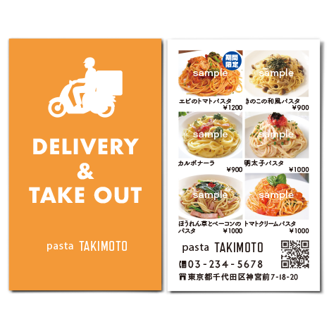 コンパクトなショップチラシ・オレンジ。シンプルな情報を印刷して、QRコードでウェブにアクセス。いつも持ち歩けるショップカードです。[左:表面 右:裏面]※サンプルの写真・QRコードはダミーです