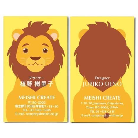 ライオンのイラスト名刺・イエロー。 かわいいシンプルデザインのライオンの名刺はインパクト抜群!存在感を演出したい方に最適です。 オフィスやイベントなど、様々なシーンで活躍する名刺です。[左:表面 右:裏面]