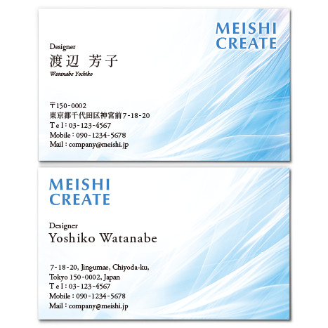 続いていく流れのイメージをデザインしたナチュラル名刺です。ブルーを基本にした流れるようなラインと柔らかな色合いが相まって、印象に残る名刺としてアイキャッチ度をグッと高めてくれます。